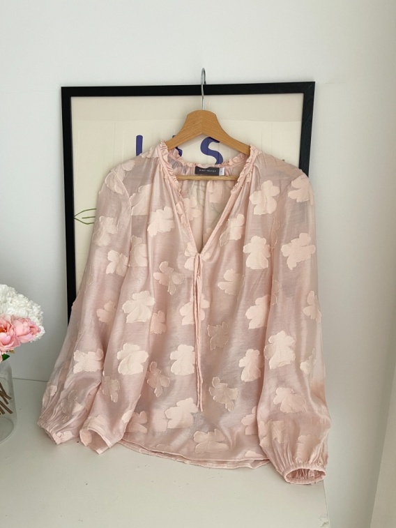Jasnoróżowa urocza bluzka z wiązaniem na dekolcie.