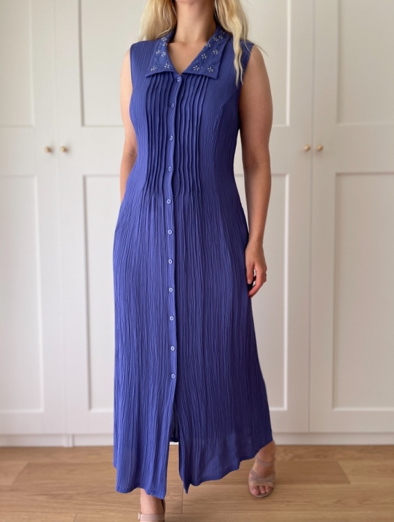 Fioletowa, unikatowa sukienka z kreszowanej wiskozy, zapinana na guziki. Posiada piękny, haftowany kołnierzyk i kieszenie. Dopasowuje się do sylwetki