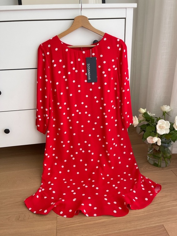 Czerwona sukienka w kropki, o prostym kroju i falbanką na dole. Zapinana z tyłu na zamek. Marka premium Sosandar.