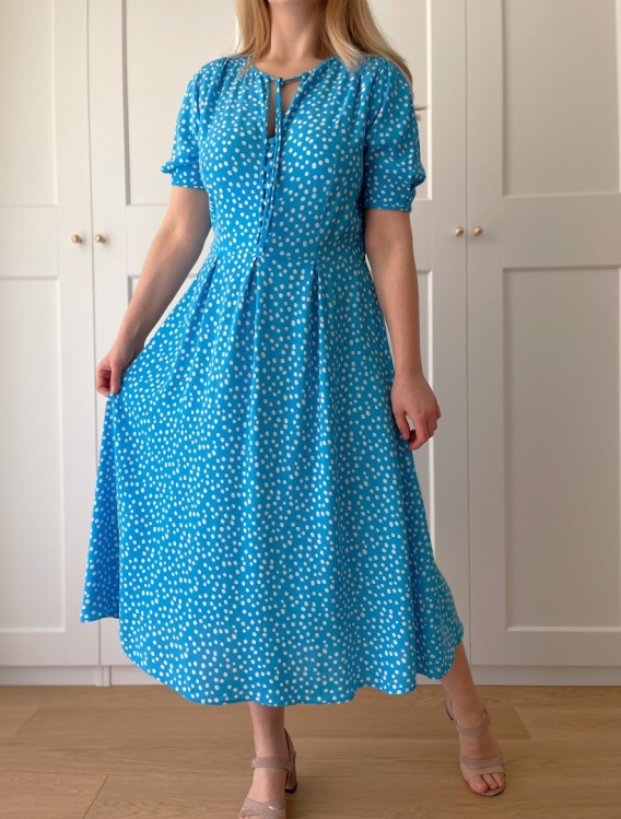 Urocza sukienka w kropki. Posiada guziki i wiązanie na dekolcie, z tyłu w talii gumka.